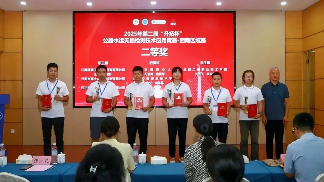 近日,由交通运输部职业资格中心主办的2025年第二届“升拓杯”公路水运无损检测技术应用竞赛——西南区域赛在成都工贸职业技术学院圆满落幕。金通检测公司选派优秀职工选手参赛,凭借过硬技术实力和出色现场表现,唐小冬、胡东伟荣获大赛“二等奖”,先良彬、罗星雨荣获“三等奖”。