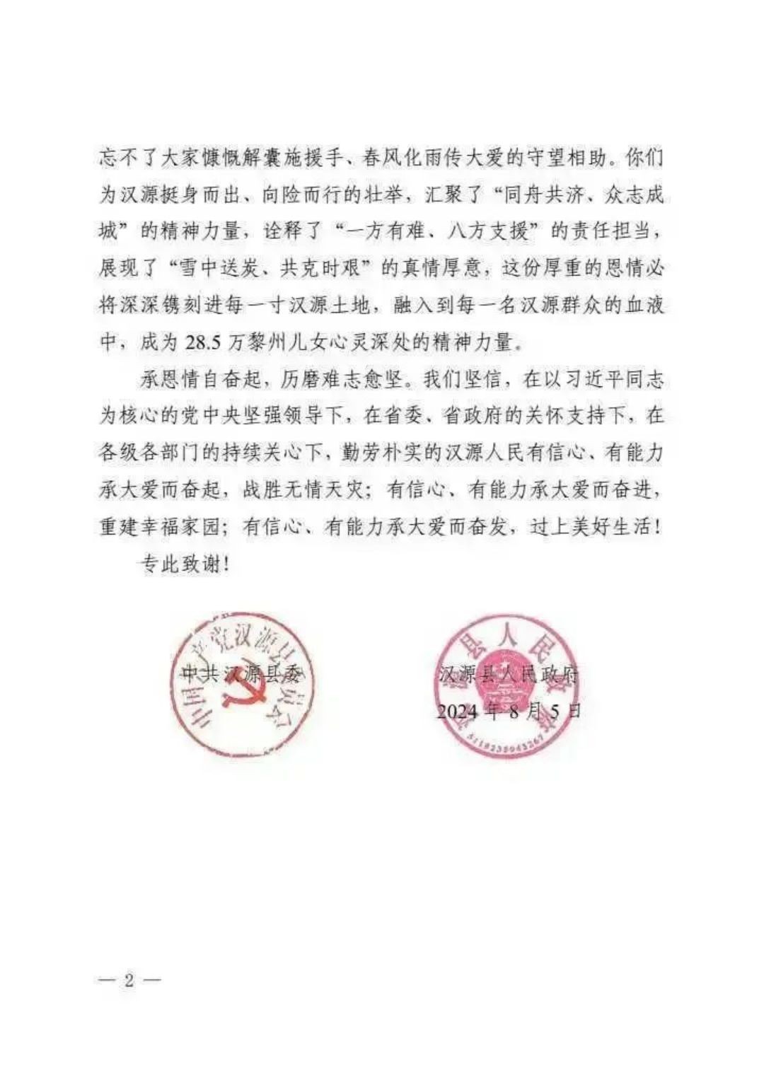 这份感谢信不仅承载着汉源地方政府及人民群众对乐汉公司在此次防汛救灾中所做工作的感激,更体现出深厚的企地情谊,是对全体乐汉人的认可和鼓舞。