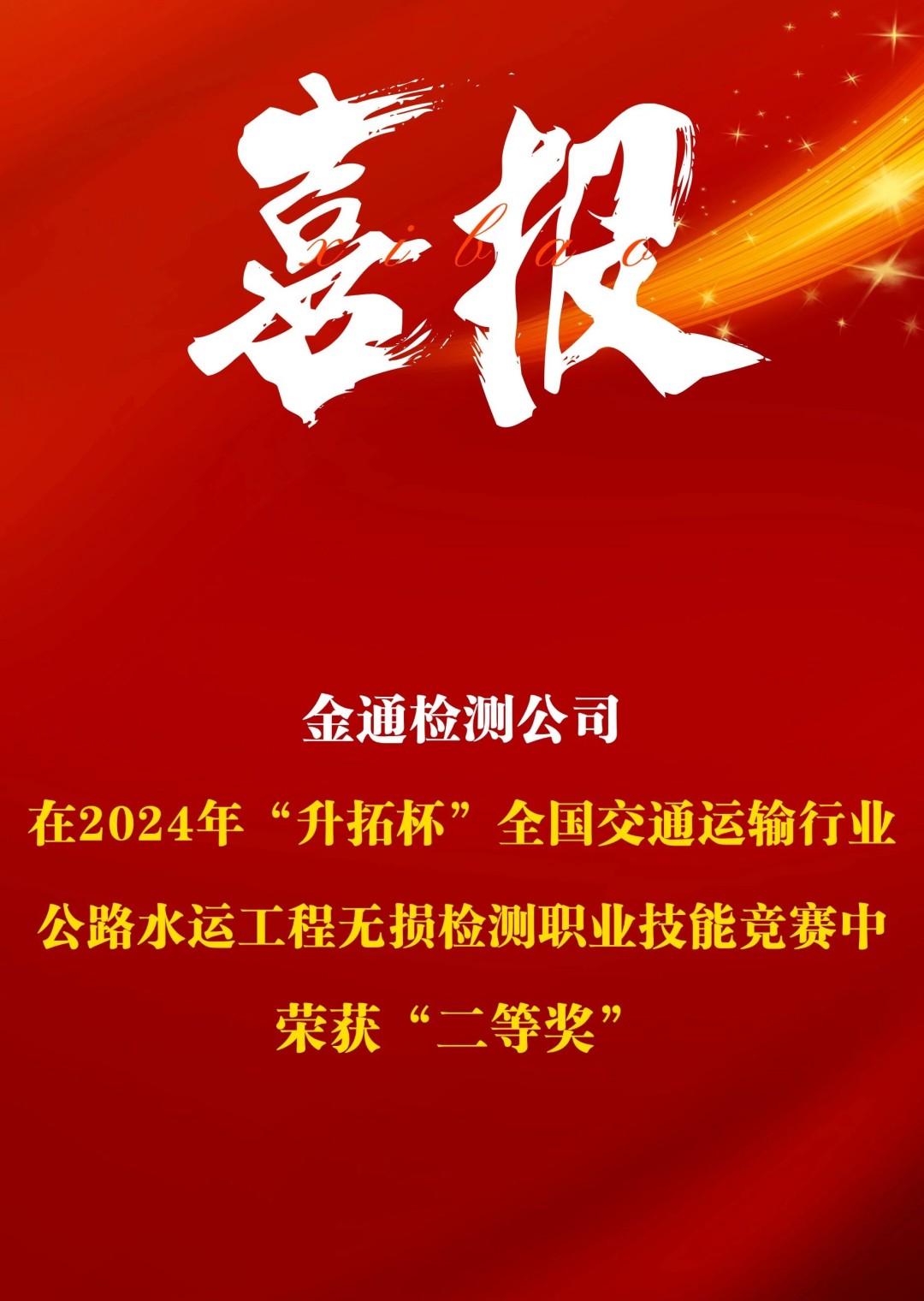 近日,2024年“升拓杯”交通运输行业公路水运工程无损检测职业技能竞赛举办全国总决赛,来自全国22个省、自治区、直辖市交通运输部门选派的职工组和学生组选手同台竞技,展开精彩角逐。其中,由金通检测公司选派的唐小冬、方锐两位职工参赛并获得职工组二等奖的优异成绩,荣获交通运输部“交通工匠”荣誉称号。