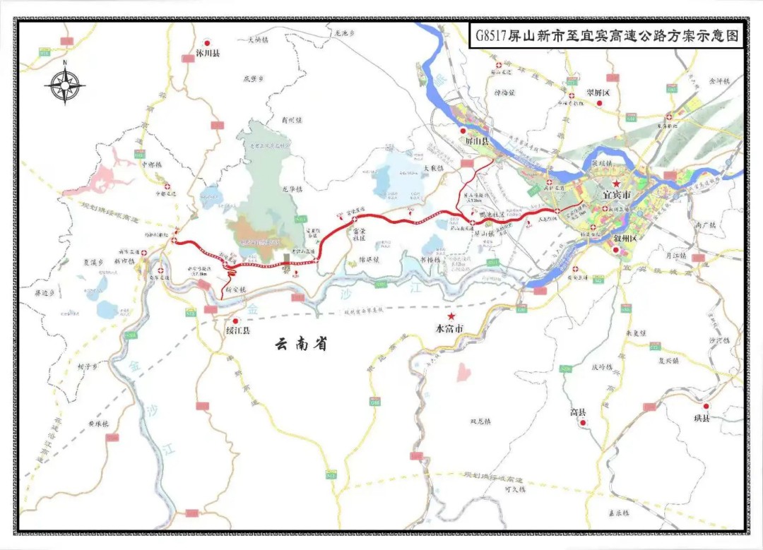 G8517屏山新市至宜宾高速公路是G8517屏山至兴义国家高速公路的组成路段,也是G4216成都至丽江、G7512贵阳至成都两条国家高速公路的联络线,被列为国家“十四五”规划102项重大工程。项目起于屏山县新市镇,接在建的G4216屏山新市至金阳高速公路,经新安镇、锦屏镇,止于叙州区柏溪街道,接已建的G7512宜宾城市过境高速公路西段。路线主线全长约65公里,连接线约24公里,总投资约143亿元。全线采用设计速度80公里/小时、双向4车道高速公路技术标准,建设工期4年。