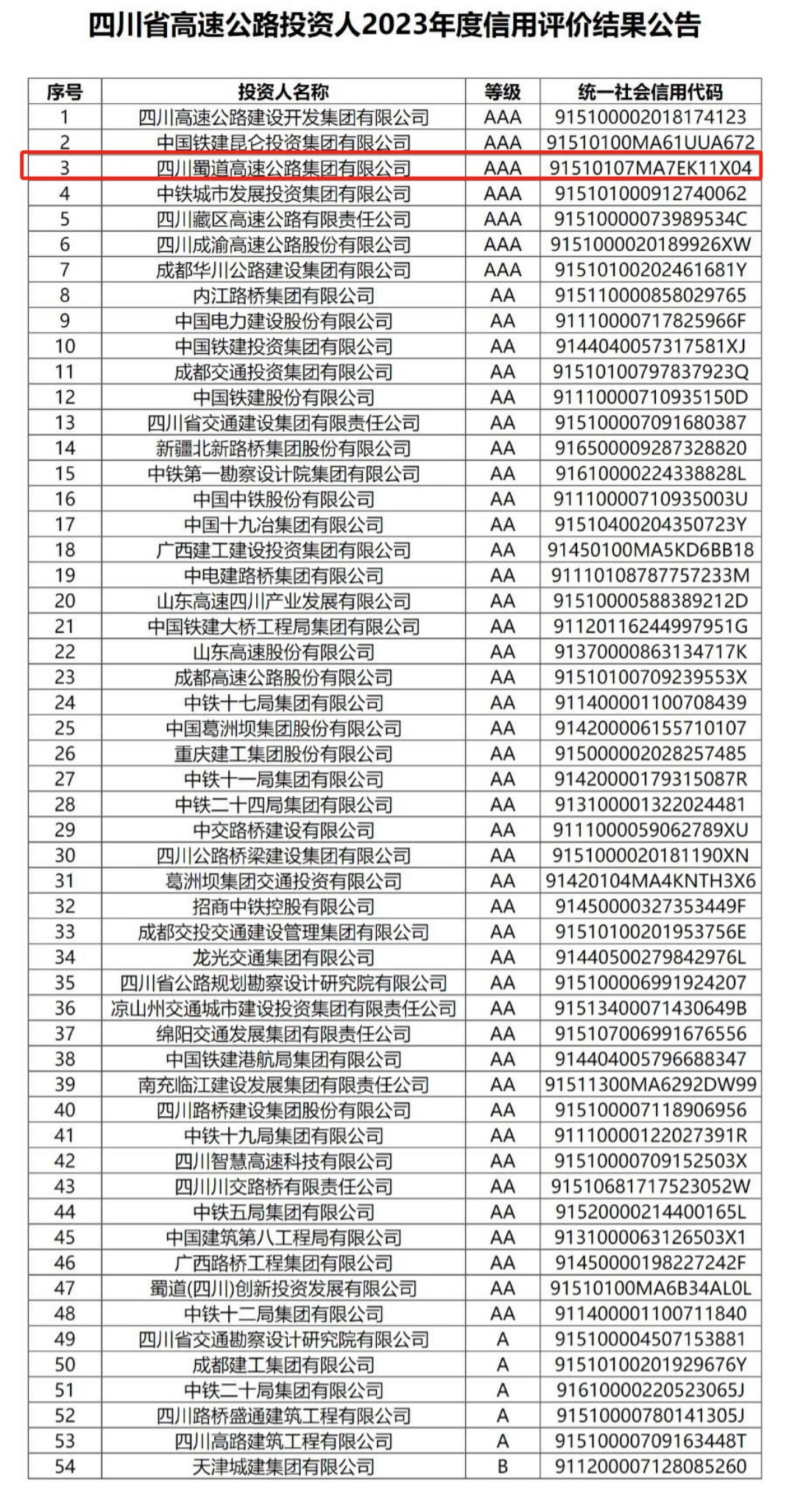 近日,四川省交通运输厅官网发布公告,BEVITOR·伟德国际集团在四川省高速公路投资人2023年度信用评价中被评为AAA等级。此次评价是根据《四川省交通运输厅关于修订印发<四川省高速公路投资人信用管理办法>的通知》(川交发〔2021〕20号)和《关于加强高速公路投资人年度信用评价的通知》(川交函〔2022〕324号),经初评、审定、公示等程序,取得2023年度信用评价等级名单公布如下: