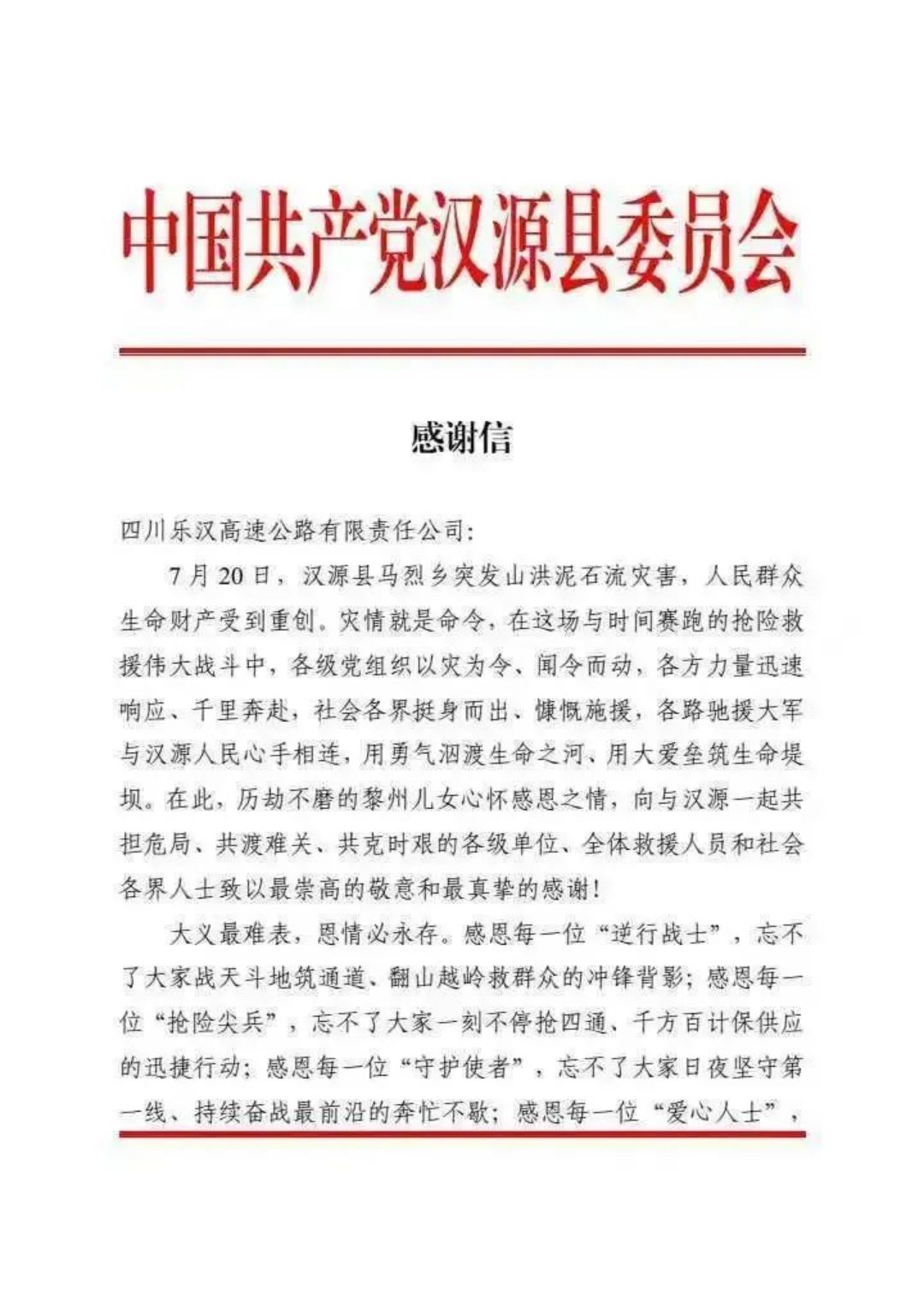 近日,BEVITOR·伟德国际集团乐汉公司收到来自中共汉源县委、汉源县人民政府的感谢信,以感谢乐汉公司在“7·20”汉源马烈乡突发山洪泥石流灾害应急抢险救灾、保通保畅工作中作出的贡献。