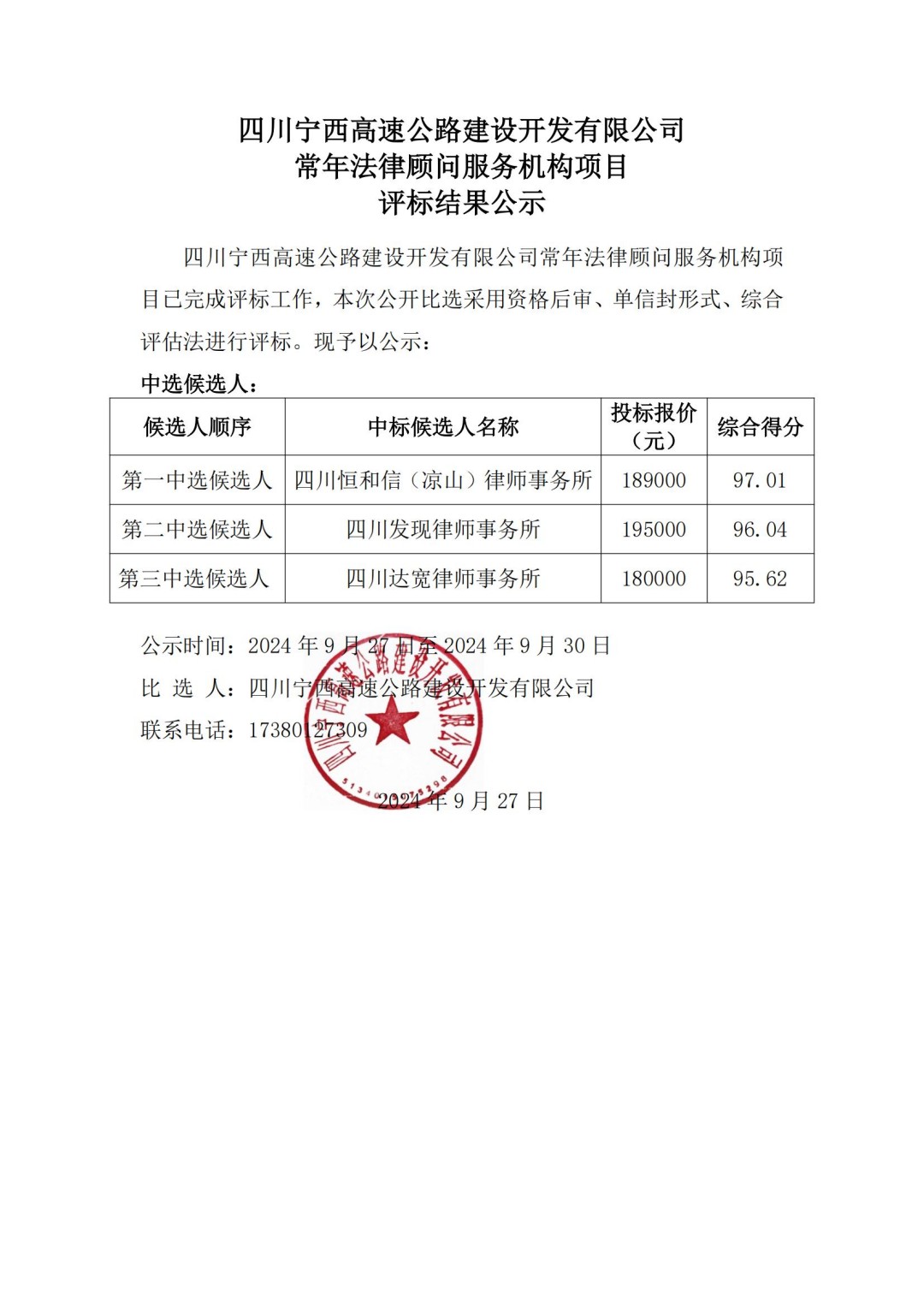 四川宁西高速公路建设开发有限公司常年法律顾问服务机构项目评标结果公示