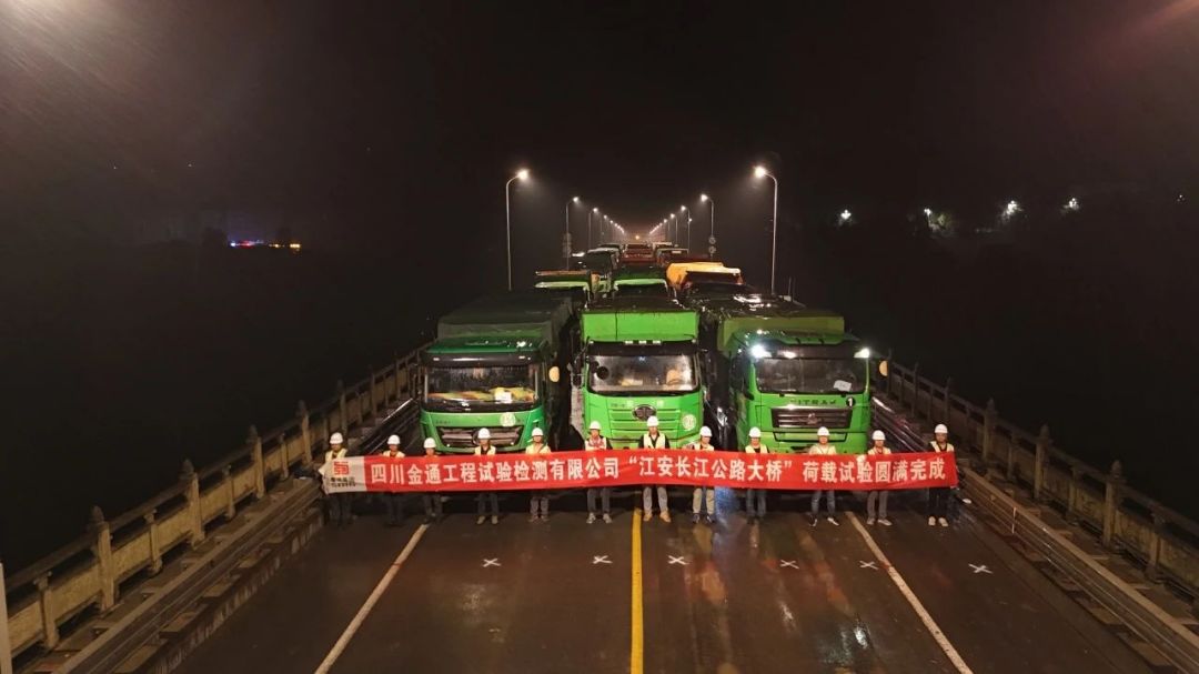 6月2日凌晨,江安长江公路大桥上灯火通明,21辆满载重物共840吨的重型卡车驶上大桥,3辆一排整齐地停放在指定位置,江安长江公路大桥主桥荷载试验正式拉开帷幕。