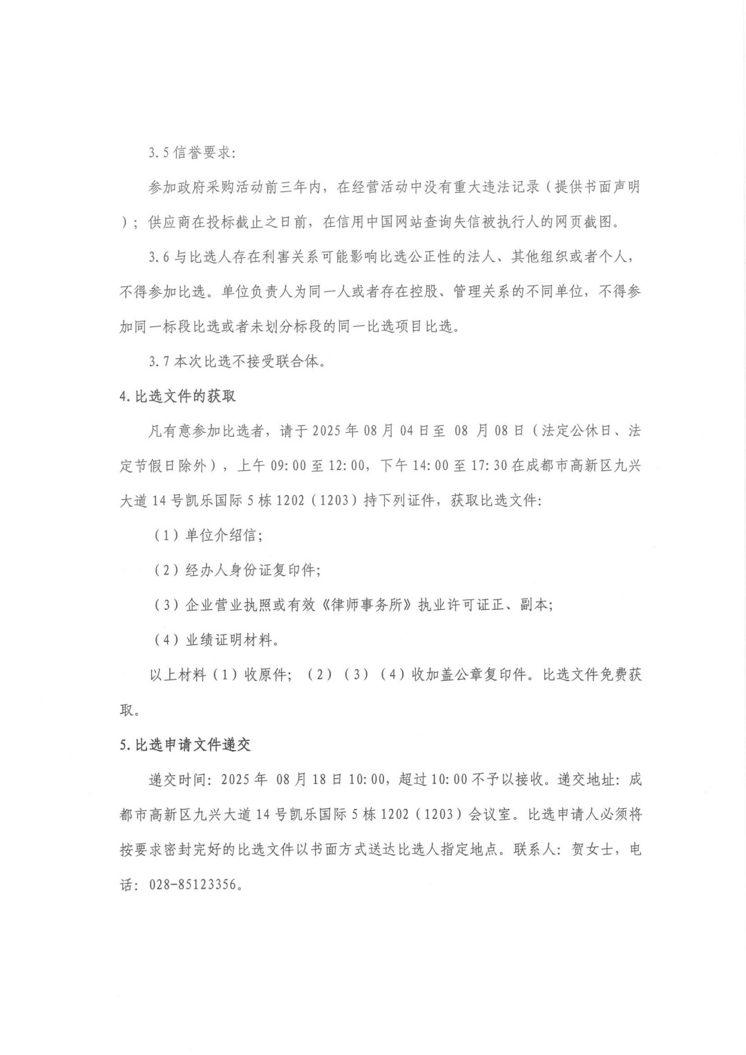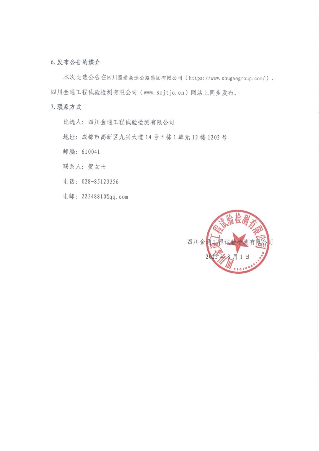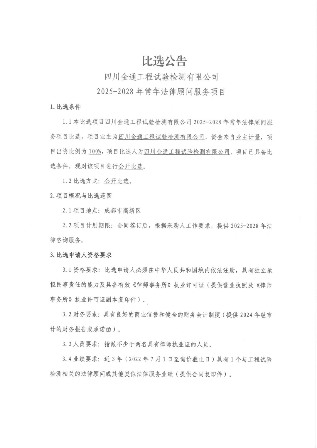 四川金通工程试验检测有限公司2025-2028年常年法律顾问服务项目(第二次)比选公告